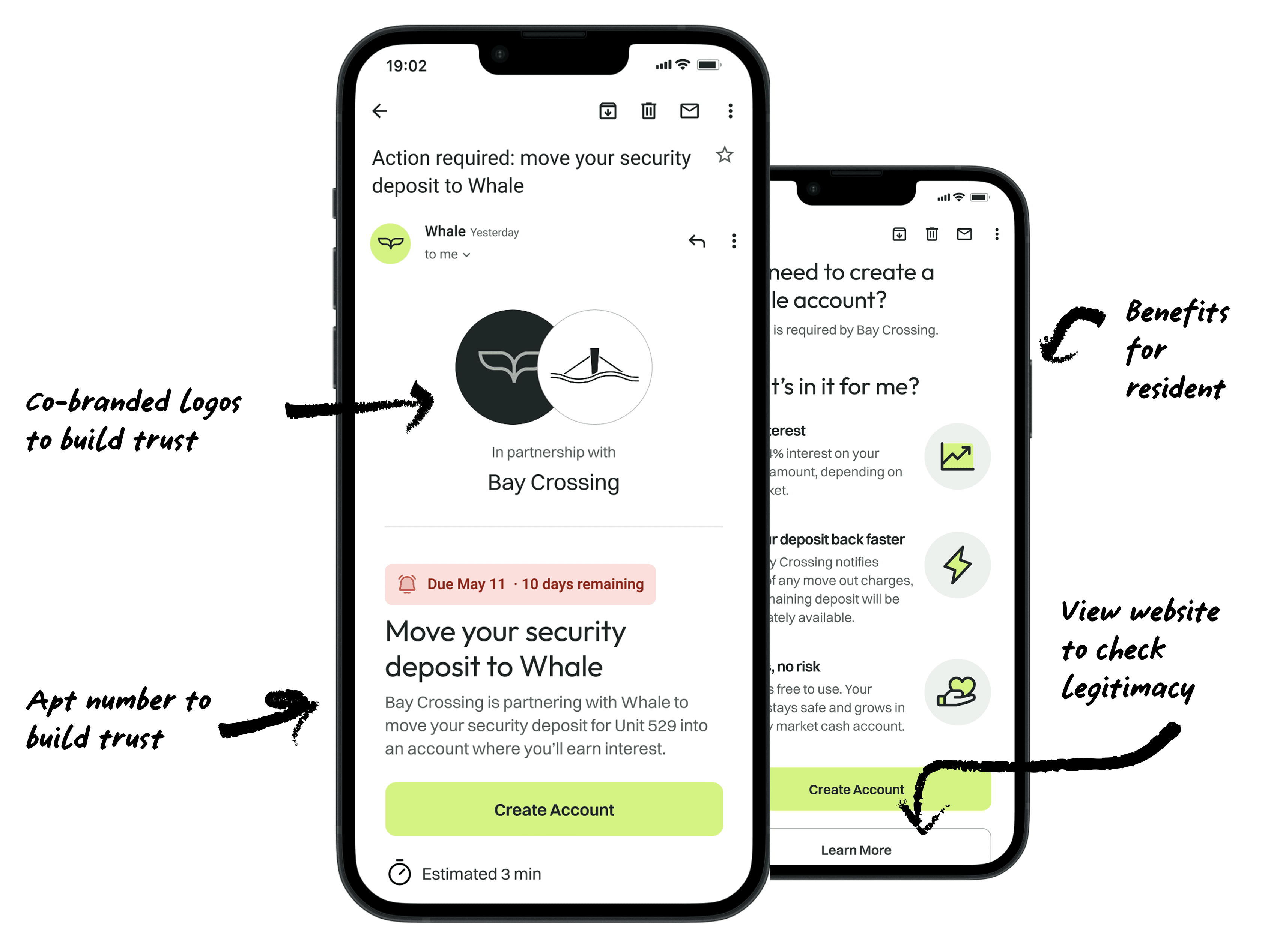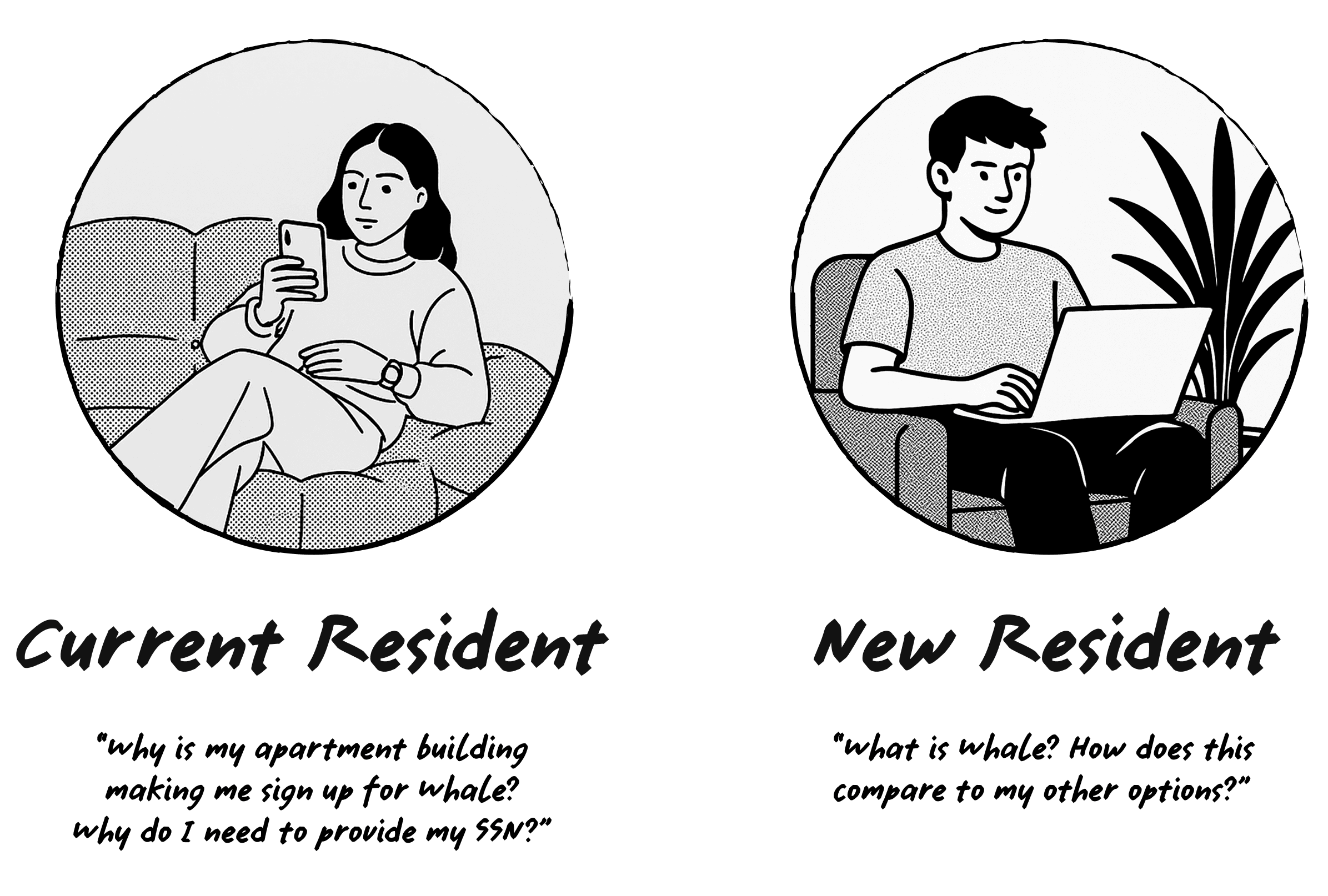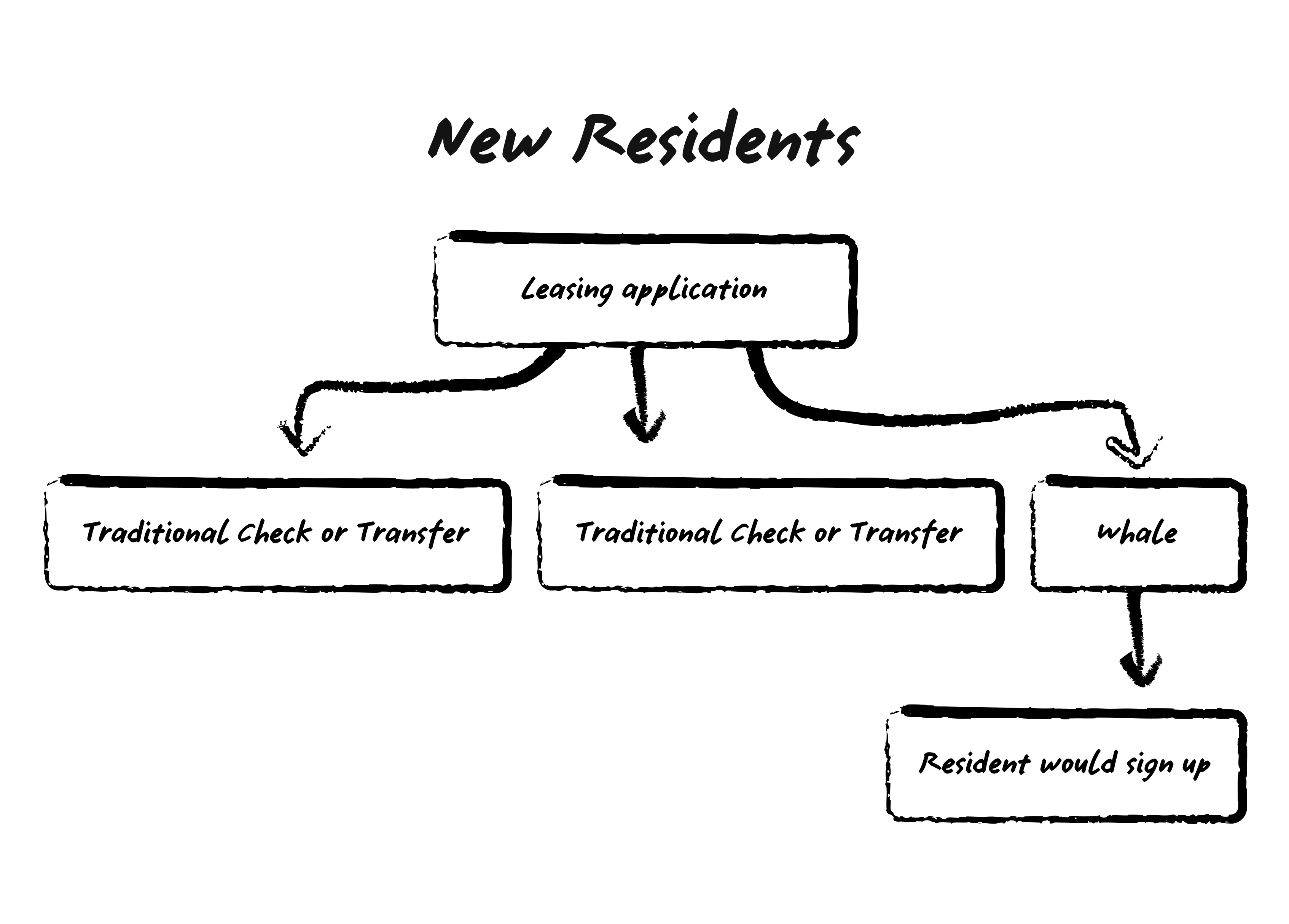 There were two ways that a resident would sign up for Whale. If a resident was signing their leasing application, they would select between competitor products or a traditional cash or bank transfer. However if the resident was already living at the property, the building would require the resident to approve the bank transfer to Whale.